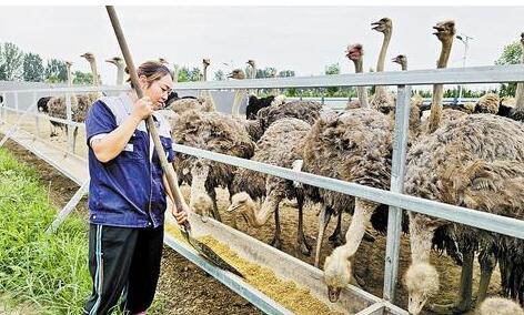 西南合村鸵鸟育苗养殖基地的饲养员在给鸵鸟喂食。河北省文明办供图