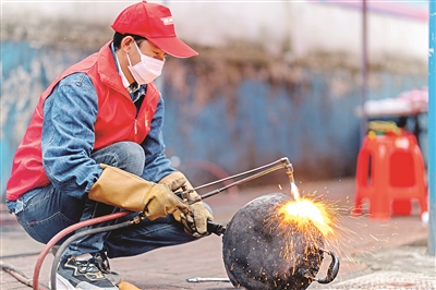 广西柳州志愿者在“雷锋街市”为市民焊补铁锅。刘兴存 袁艺华 摄